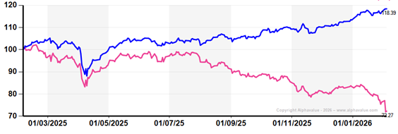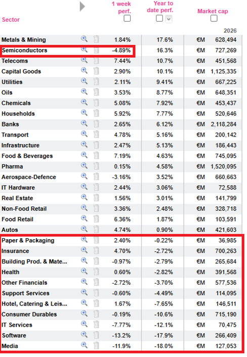 Ouch! (in pink, AI impacted stocks; 29; equal weighting… Stoxx600 in blue)