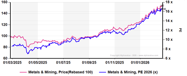 Metals & Mining index (pink) and related PE (blue)