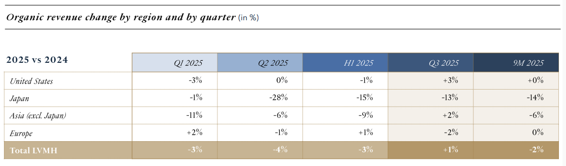 Asia strengthened, with China back to growth. Brand desirability is reactivated through focused initiatives and investment at key houses, supporting traffic and mix despite persistent macro volatility.