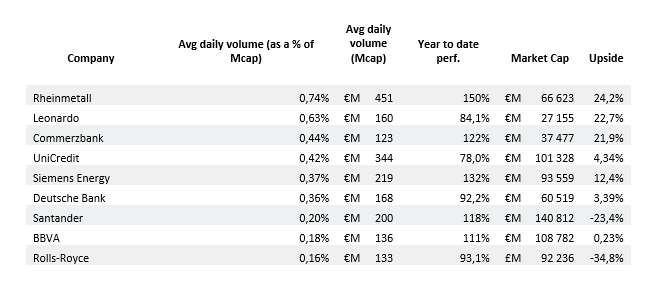 The table below is crossing the highest decile of the ytd performers in AlphaValue European coverage with the highest decile for daily volumes expressed in €M.