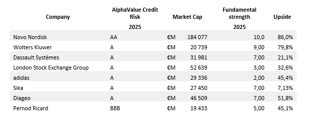As contrarian born market participants, we would buy into this quality universe (see next table, balance sheet rating and business model strength) with closed eyes. However Dassault Systèmes would be best avoided, up until governance clarity is provided.